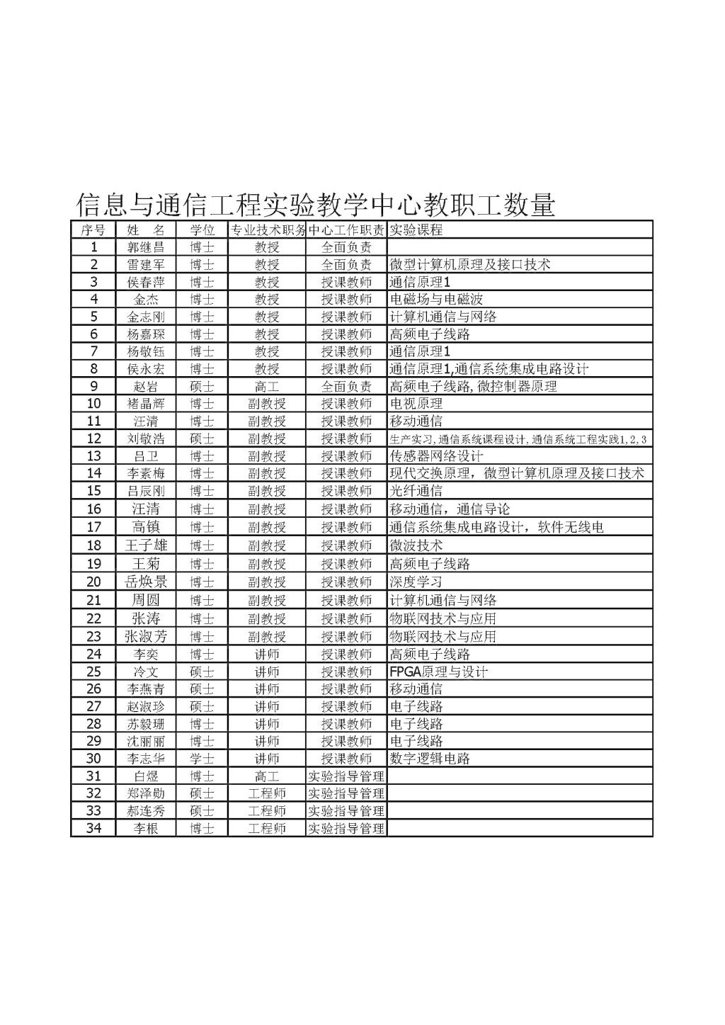 中心负责人郭继昌教授学术水平高、教学科研实践经验丰富,热爱实验教学、曾担任多年教学副院长,管理能力强。实验教学中心共有教师34人。教师中正高级9人,副高级15人,中级职称10人,具有博士学位的比例为76%。